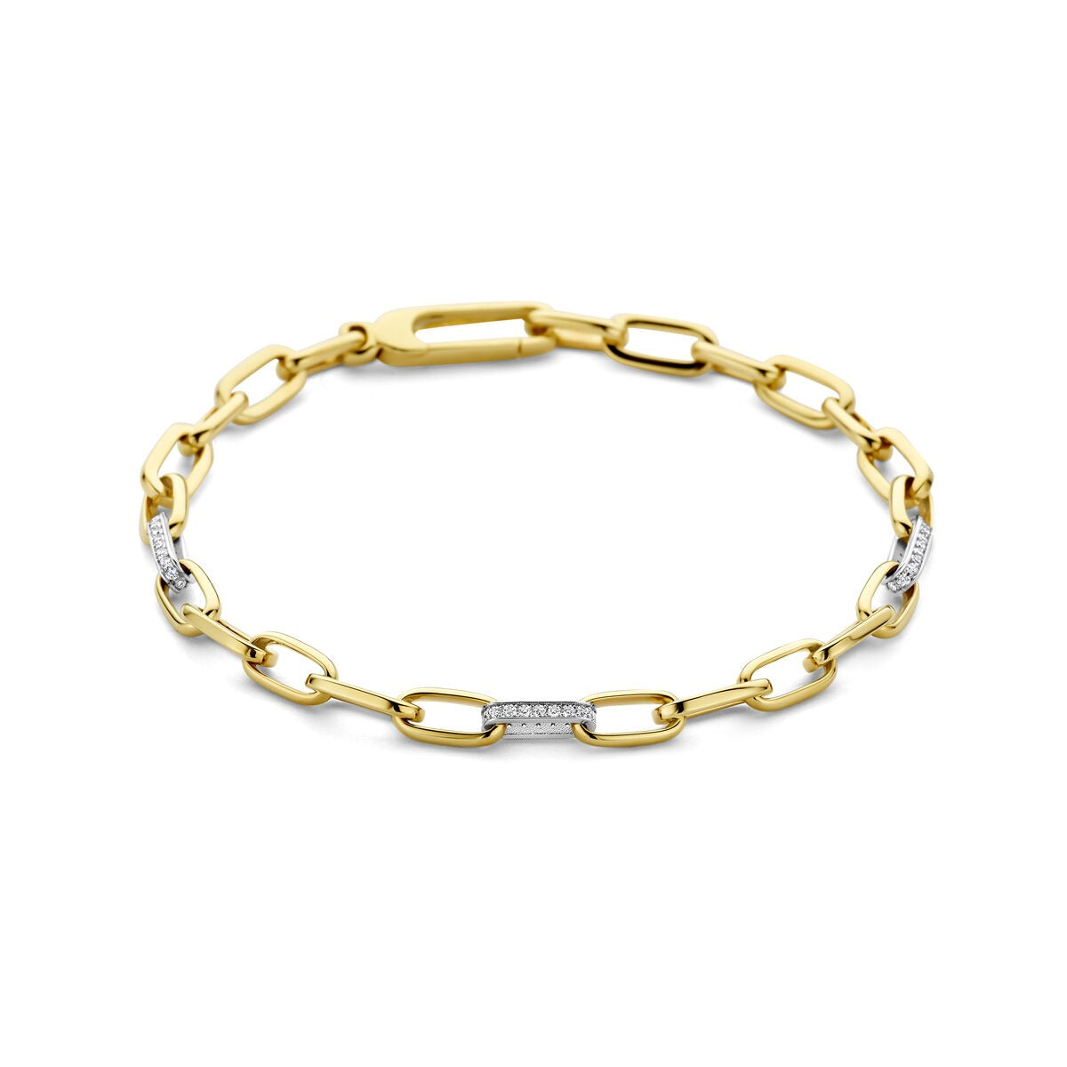 Deze bicolor armband met diamant is een prachtig voorbeeld van verfijnd vakmanschap en moderne elegantie. Vervaardigd uit 14 karaat geel- en witgoud, combineert het ontwerp warme en koele goudtinten tot een stijlvol geheel. De briljant geslepen diamanten – met een totaalgewicht van 0.27 ct en zuiverheid SI2 – zijn subtiel in rijzetting geplaatst, wat zorgt voor een fonkelend effect bij elke beweging.
