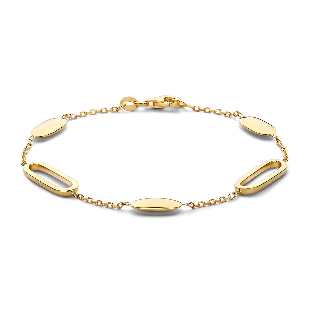 Geelgouden schakelarmband met paperclipschakels en ovale, gouden elementen.