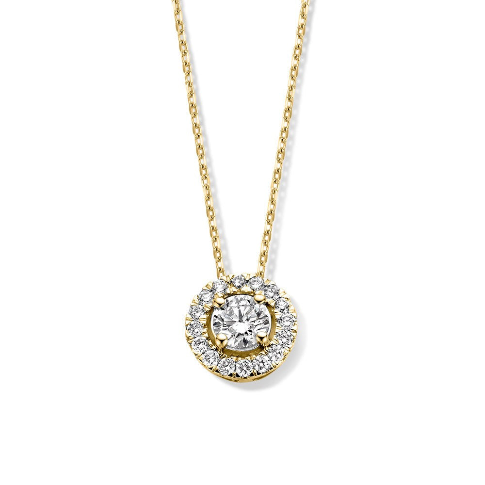 Emma is een serie schitterende sieraden met entourage zetting. De ronde middensteen (briljant geslepen) wordt hierbij omringd door kleinere briljanten. Kies zelf de gewenste steengrootte van jouw diamant. De Emma hanger is in verschillende maten beschikbaar.