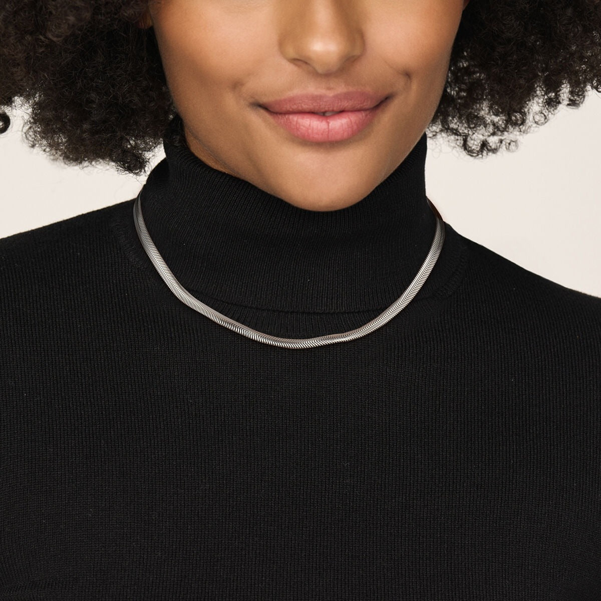 Dit gerhodineerd 925 zilveren slangencollier is een krachtig stijlstatement met een elegante, vloeiende vorm. De platte slangschakel van 6,3 mm breed vormt een glanzend en soepel lint rond de hals, met een luxe uitstraling die moeiteloos de aandacht trekt. De gerhodineerde afwerking geeft het collier extra glans en beschermt het zilver tegen verkleuring, waardoor het zijn frisse, zilverkleurige look lang behoudt.