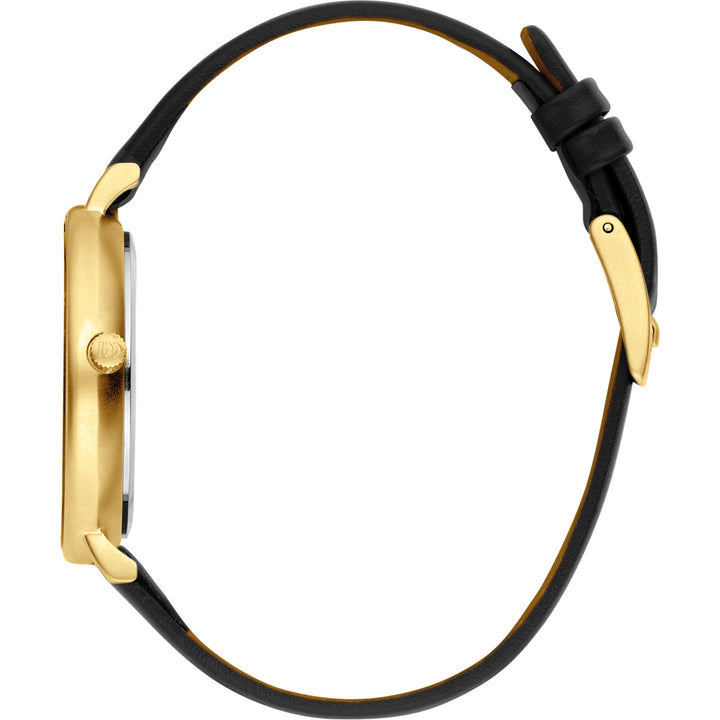 De roestvrijstalen kast straalt duurzaamheid en luxe uit, met een indrukwekkende diameter van 35 mm en een slanke dikte van 6,8 mm. De leren band in tijdloos zwart voegt niet alleen comfort toe, maar benadrukt ook de klassieke uitstraling.