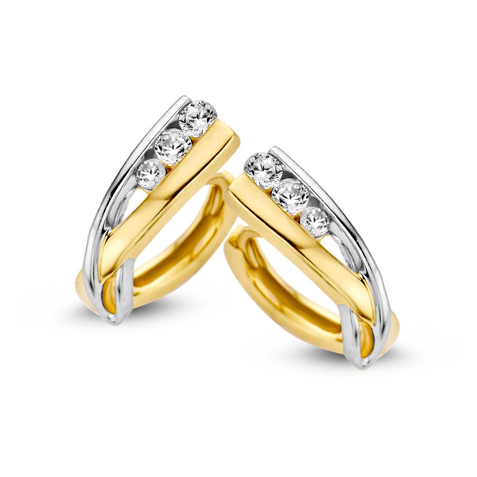 Bicolor geel- en witgouden creolen met zirkonia. De creolen hebben een verlaagde steker, waardoor ze mooi over de gaatjes heen vallen.