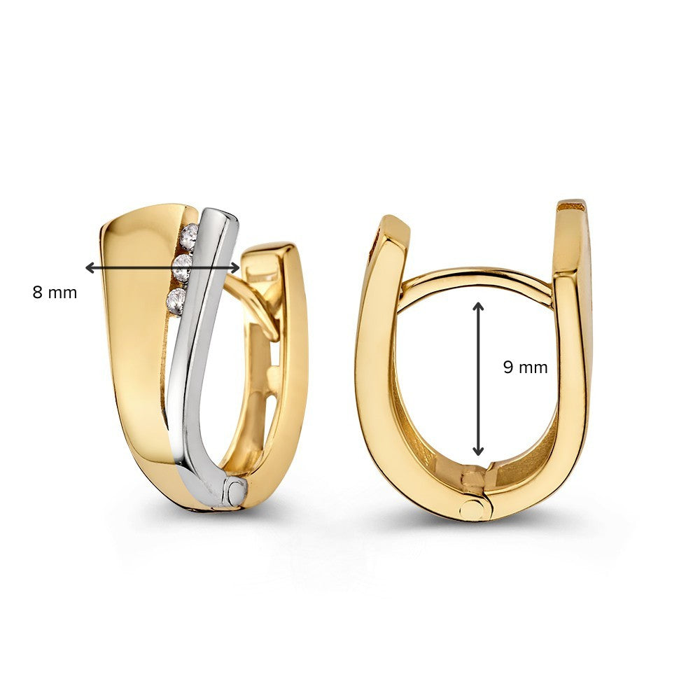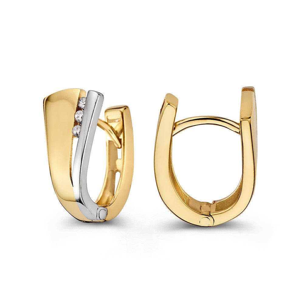 Bicolor wit- en geelgouden oorringen met drie zirkonia's. Dankzij de brede voorzijde en verlaagde steker vallen de oorbellen mooi over de oorlel heen.